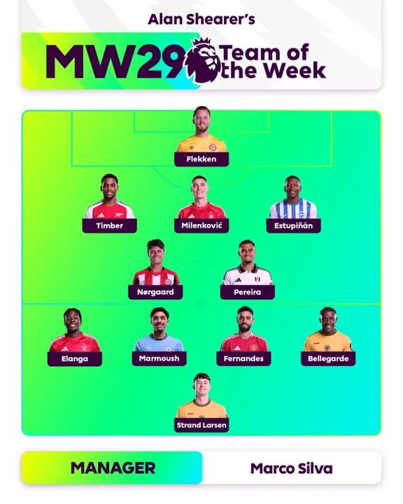 中场:诺尔高(布伦特福德)、佩雷拉(富勒姆)、伊兰加(诺丁汉森林)、马尔穆什(曼城)、B费(曼联)、贝莱加德(狼队)