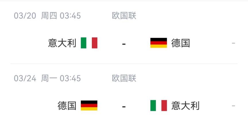此前的欧国联小组,德国队力压荷兰、匈牙利和波黑以小组第一晋级淘汰赛,在1/4决赛中,他们要面对的是意大利队。德国与意大利将在北京时间3月20日和3月24日凌晨进行两回合主客场的交锋。