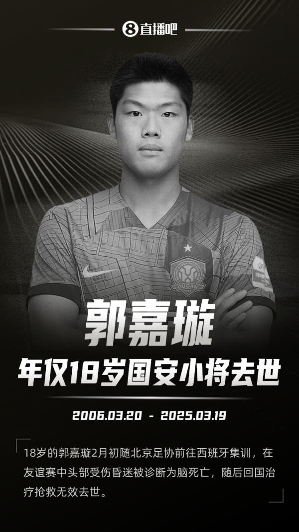 03月20日讯 国安小将郭嘉璇今日在天坛医院去世,年仅18岁。据极目新闻报道,郭嘉璇遗体将在北京安葬。