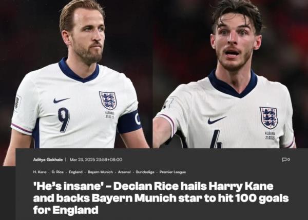 赖斯说:“他是个疯狂的家伙,在英格兰队的训练和比赛中,我早就见识过凯恩的能力了,他无数次用进球拯救球队,还有梅开二度和帽子戏法。凯恩已经为英格兰队打进了70球,他是一名令人感到不可思议的球员,也是一位伟大的队长。凯恩正在向着国家队百球成就迈进,我相信他一定能够做到。”