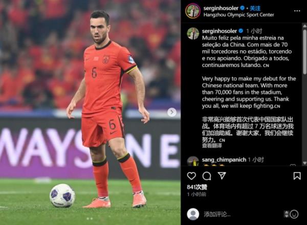 塞尔吉尼奥更新个人社媒,晒出个人赛场照,并用中英葡三种语言写道:非常高兴能够首次代表中国国家队出战。体育场内有超过 7 万名球迷为我们加油助威。谢谢大家,我们会继续努力。