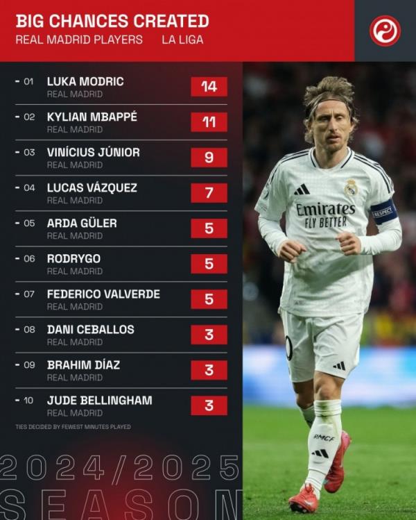 据统计,尽管本赛季只首发出战了11场比赛,但莫德里奇本赛季在西甲创造机会的次数仍然是全队最高,比第二名的姆巴佩多出三次。
