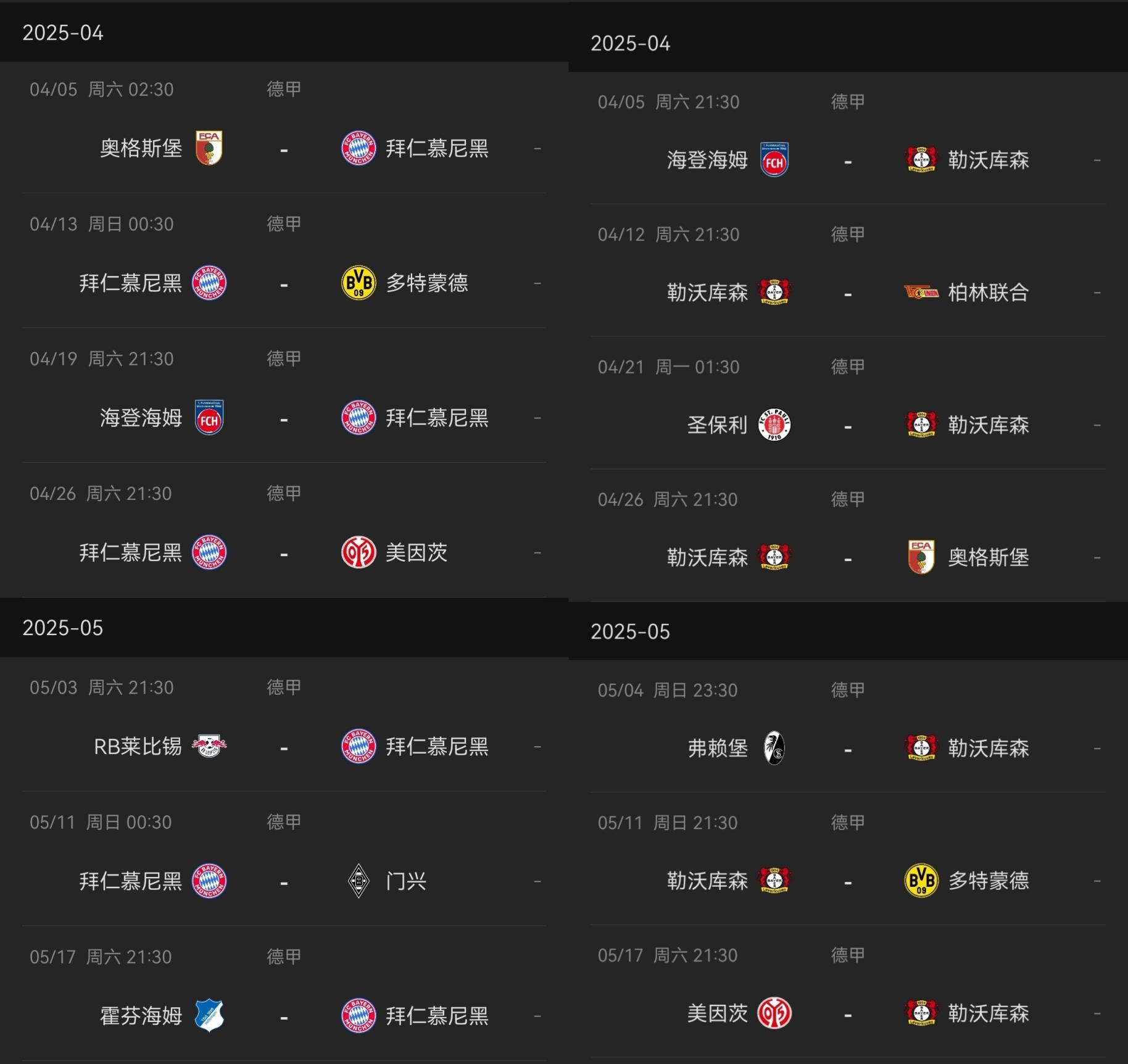 后续赛程对比上,拜仁还要对阵积分榜上半区的奥格斯堡、美因茨、莱比锡和门兴,除此以外还有与多特的国家德比。