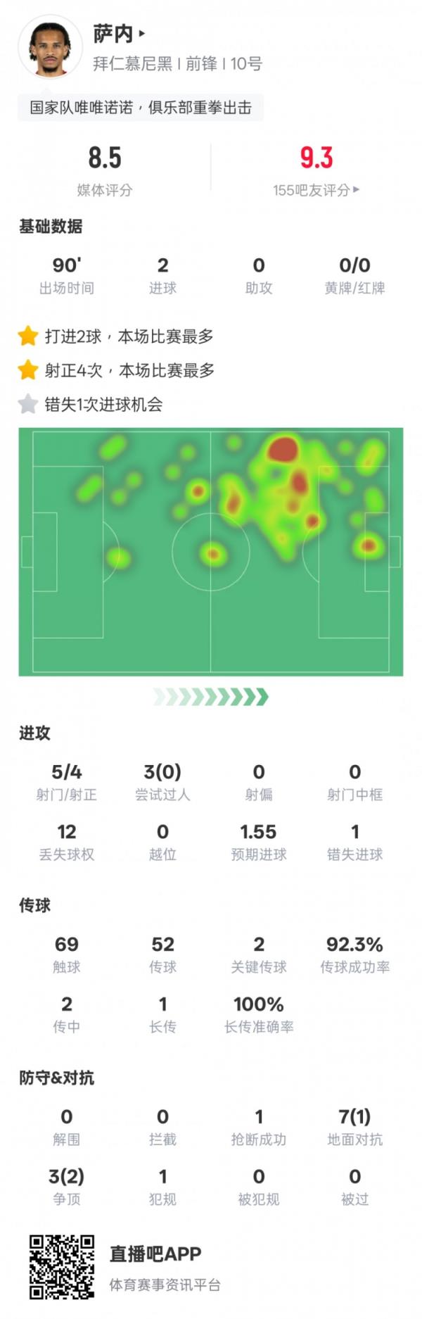 萨内本场比赛数据如下: