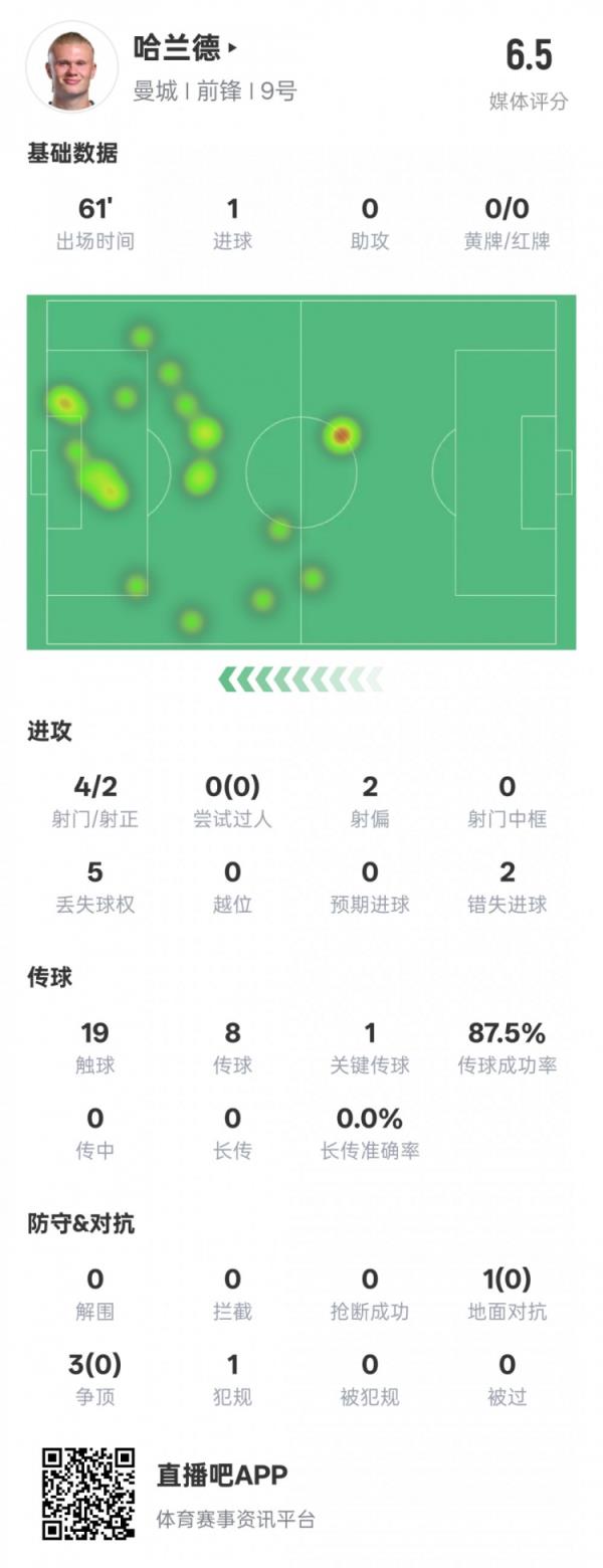 3月31日讯 足总杯1/4决赛曼城对阵伯恩茅斯,哈兰德首发出战,打进1粒进球,送出1次关键传球,但也有2次错失进球机会,评分6.5。