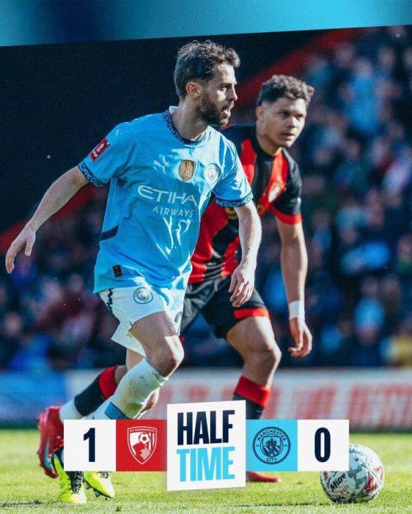 上半场伤停补时1分钟,半场结束,伯恩茅斯暂1-0曼城。