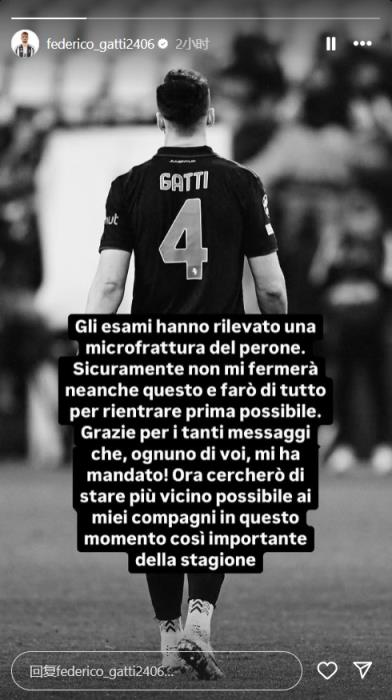 这名中卫更新社媒,说道:经检查发现腓骨出现轻微骨折,这当然不会阻挡我,我会尽一切努力尽快回来,谢谢你们给我发来的信息,在本赛季现阶段这样非常重要的时刻,我会尽可能与我的队友们保持密切联系。