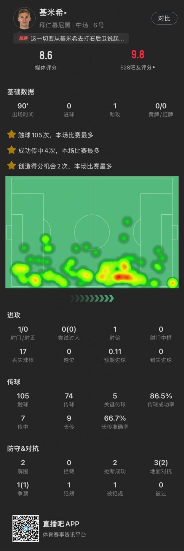3月10日讯 德甲第25轮,拜仁8-1血洗美因茨。本场比赛,基米希改踢右后卫,并打满全场,获评8.6分全场第四高。