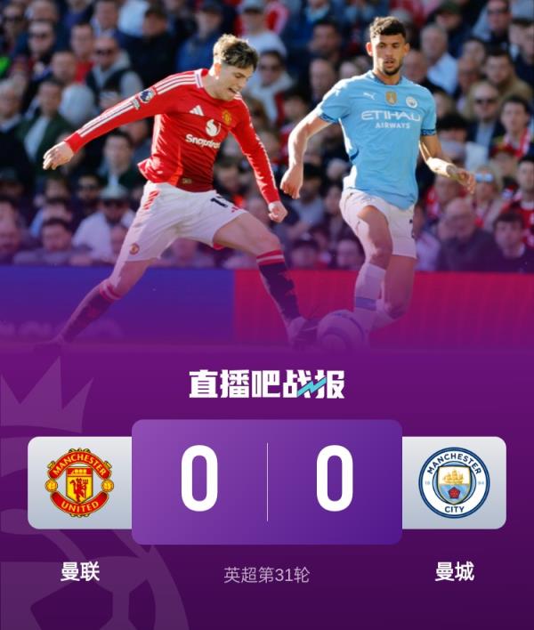 04月07日讯 英超第31轮,曼联0-0战平曼城,曼市德比4场不败。