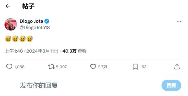 03月11日讯 利物浦1-1战平曼城赛后,若塔社媒发了4个