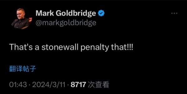 针对多库的动作,知名曼联球迷、YouTube知名主播“马金桥”Mark GoldBridge也在社交媒体上吐槽:这一下是个铁点球!!!