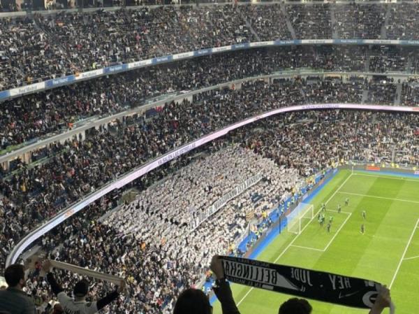 3月11日讯 西甲第28轮,皇马主场对阵塞尔塔的比赛正在进行。现场的皇马球迷拉出横幅,声援遭到禁赛的贝林厄姆。横幅中写道:Hey Jude!马德里主义者们(皇马球迷的昵称)和你同在!