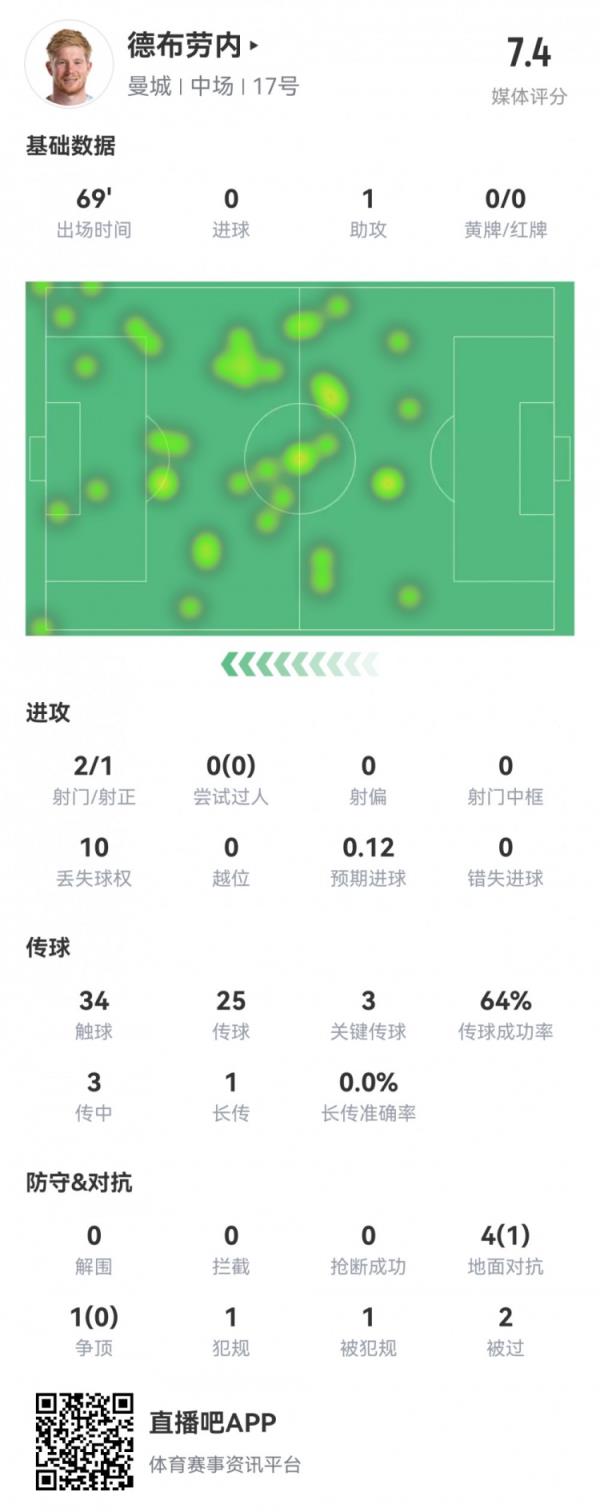 3月11日讯 本轮英超焦点战,利物浦主场暂1-1曼城。德布劳内首发出战69分钟送出一记助攻,球员全场重点数据如下↓