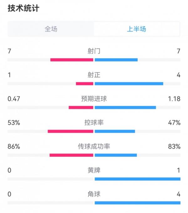 3月11日讯 本轮英超焦点战,利物浦主场暂0-1半场落后曼城。双方半场数据对比如下↓