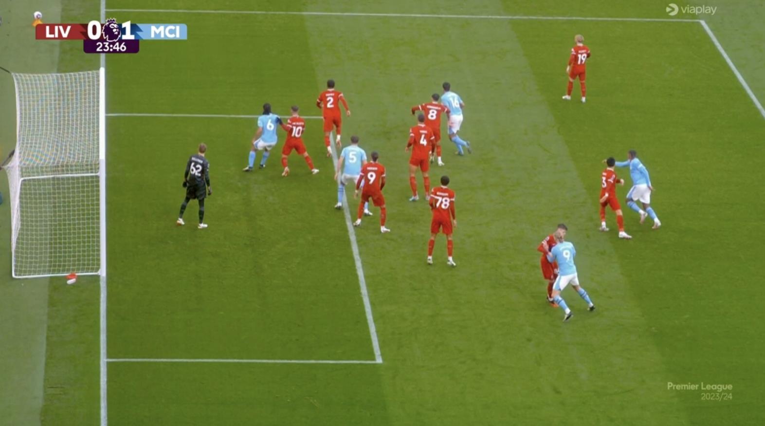 03月11日讯 上半场利物浦vs曼城角球进球前,阿克在前点一步步把麦卡挤出了位置,之后斯通斯在这个位置完成进球。