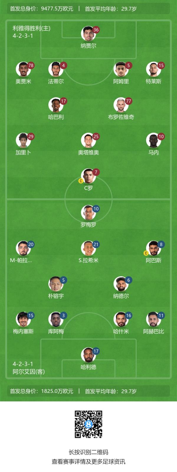 利雅得胜利首发:36-纳贾尔、78-奥贾米、4-法蒂尔、5-阿卜杜拉-阿姆里、15-特莱斯、17-哈巴利、77-布罗佐维奇、29-加里卜、25-奥塔维奥、10-马内、7-C罗