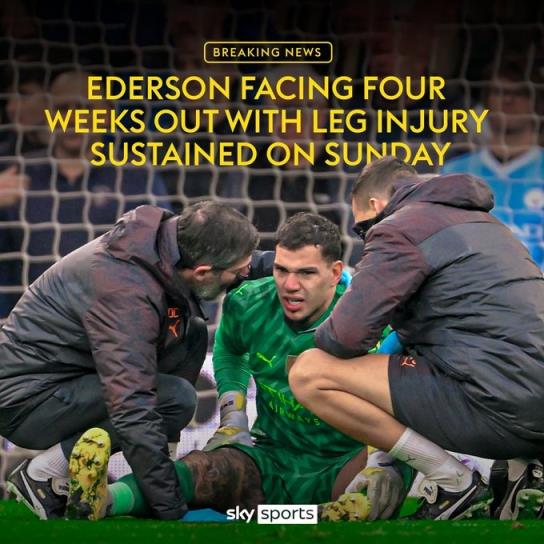 03月12日讯 曼城门将埃德森在对阵利物浦比赛中受伤,天空体育最新消息,埃德森将因腿伤最多伤停4周。