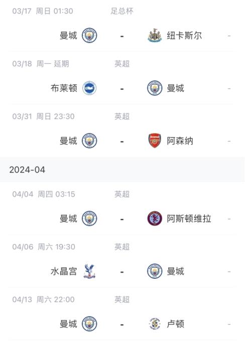 曼城未来赛程: