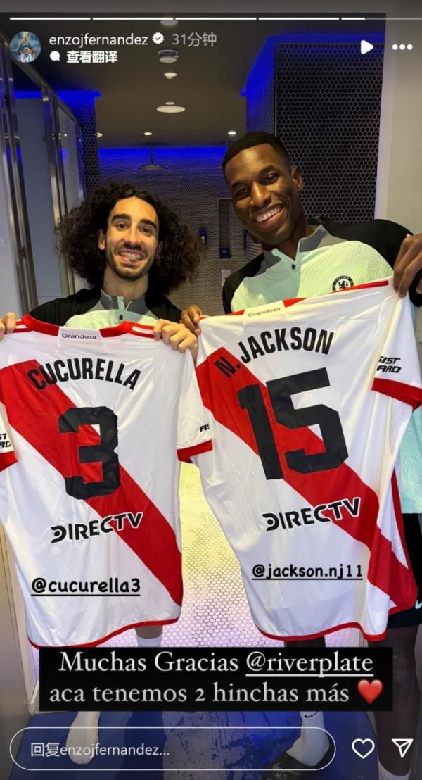 恩佐-费尔南德斯将老东家河床的定制球衣赠送给库库雷利亚和杰克逊,球衣上还印有两人的名字,恩佐在社交媒体上晒出照片,并写道:“非常感谢河床,这里又多了两个球迷。”
