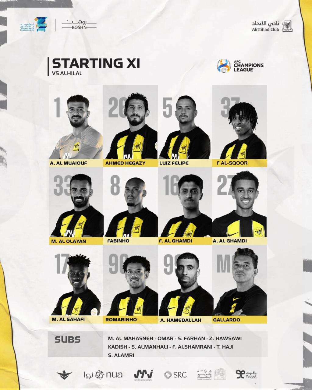 吉达联合替补:35-马哈斯内、4-奥斯曼、6-法尔汉、12-扎卡里亚-豪萨维、15-卡德什、25-门哈利、29-沙姆拉尼、52-哈吉、77-阿姆里