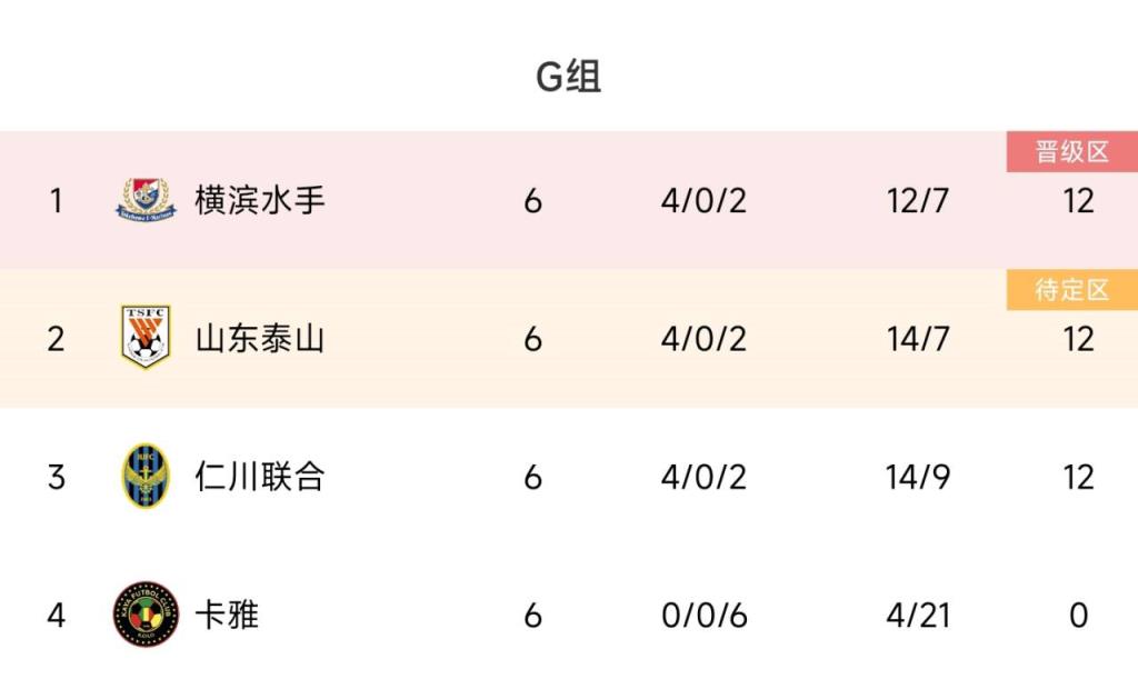 山东泰山本届亚冠分在G小组,同组对手有横滨水手、仁川联合、卡雅。小组赛泰山4胜2负,分别是双杀仁川联合和卡雅,然后遭到横滨双杀。最终泰山仁川横滨三队同积12分,泰山力压仁川第2出线。