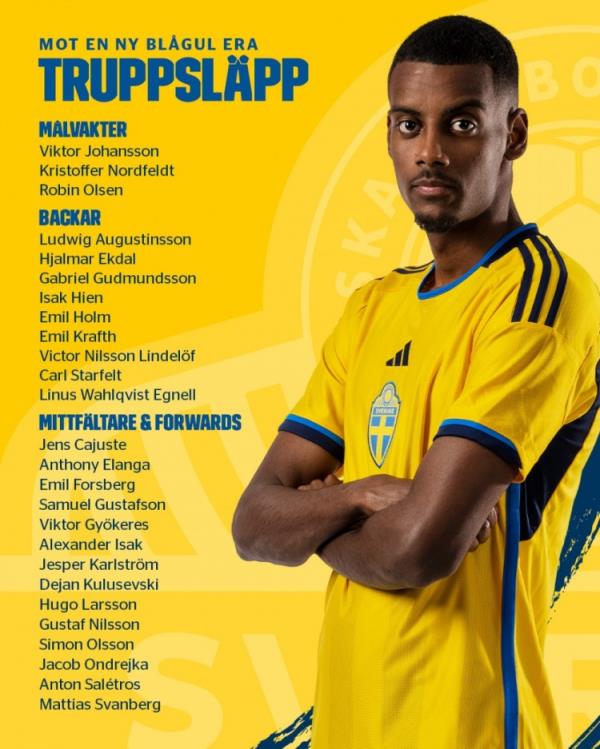 中前场:卡尤斯特(那不勒斯)、伊兰加(诺丁汉森林)、福斯贝里(纽约红牛)、古斯塔夫松(赫根)、吉奥克雷斯(葡萄牙体育)、伊萨克(纽卡)、卡尔斯特伦(列日普斯纳)、库卢塞夫斯基(热刺)、雨果-拉尔森(法兰克福)、尼尔森(圣吉罗斯)、奥尔松(中日德兰)、昂德雷卡(安特卫普)、萨雷特罗斯(AIK索尔纳)、斯万贝里(沃尔夫斯堡)