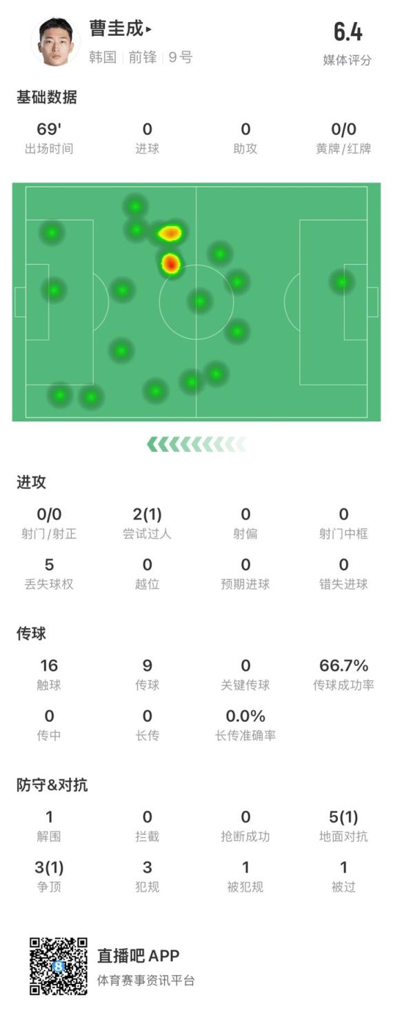 2月3日讯 亚洲杯1/4决赛,韩国队vs澳大利亚队,曹圭成首发出战69分钟,获评6.4分全队最低。
