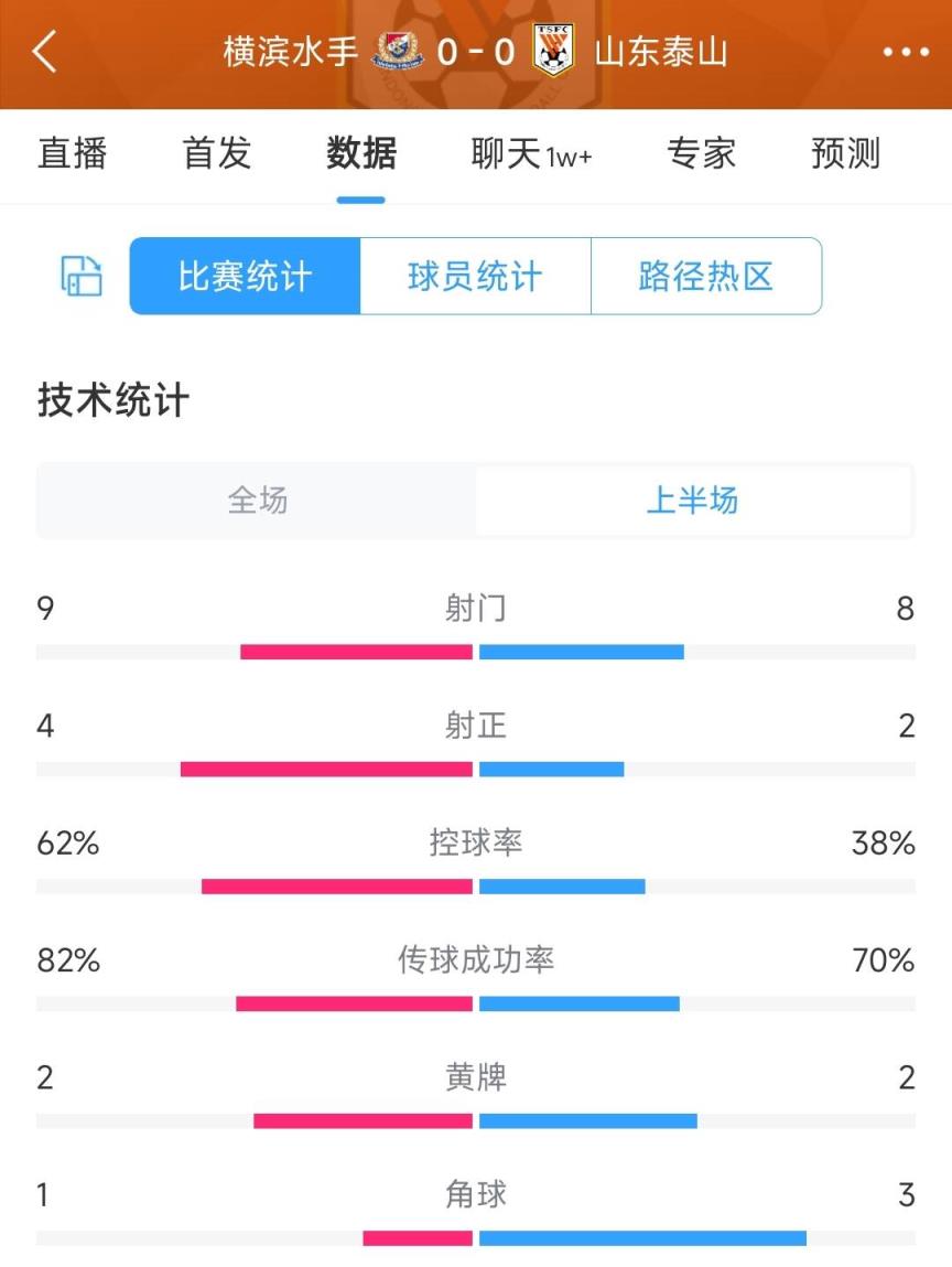 03月13日讯 亚冠1/4决赛次回合,山东泰山客场对阵横滨水手,上半场泰山0-0与横滨战平,总比分泰山1-2落后。双方半场基础数据如下。