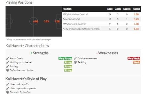 哈弗茨也不只是纯战术棋子,他也有自己的杀招。在英超联赛中,他多次跑后点发起攻击,也算是一个个人新标签。