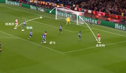 萨卡主导推进时,本怀特从侧翼套上、空位传中找后点,哈弗茨拍马杀到也是一套组合拳。