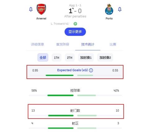 从统计数据可以看到,阿森纳在预期进球和射门数上都占优,比第一回合时要好得多。