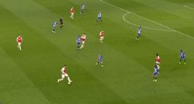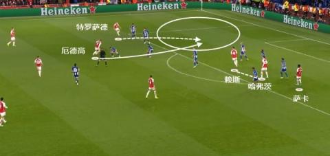 再来看看这一次的进攻,禁区中路是赖斯和哈弗茨(波尔图防守人有一个明显的横移,靠向哈弗茨,让肋部空间放大),右路萨卡吸引防守注意力,肋部厄德高获得巨大的空间。