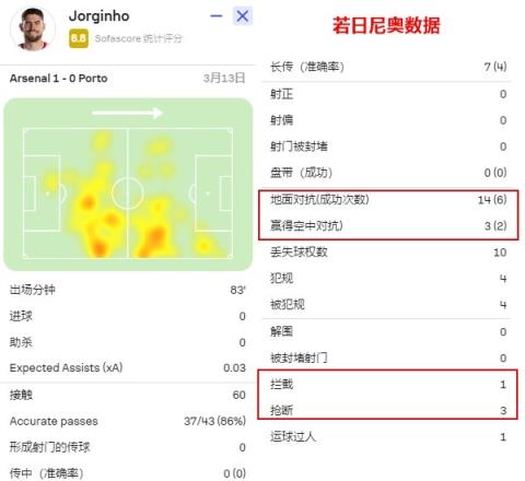 若日尼奥本场的表现是要分时段的,上半场他起到了很大的作用,不过在体能下降后,若日尼奥就很难维持住阿森纳的体系运转。