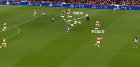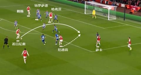 开局阶段,若日尼奥的存在感很强,这一次就是本怀特传给若日尼奥,后者再巧妙传给萨卡,带来起速机会。