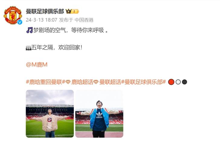 03月13日讯 曼联官方微博发布动态,晒出知名艺人鹿晗在老特拉福德球场的照片。