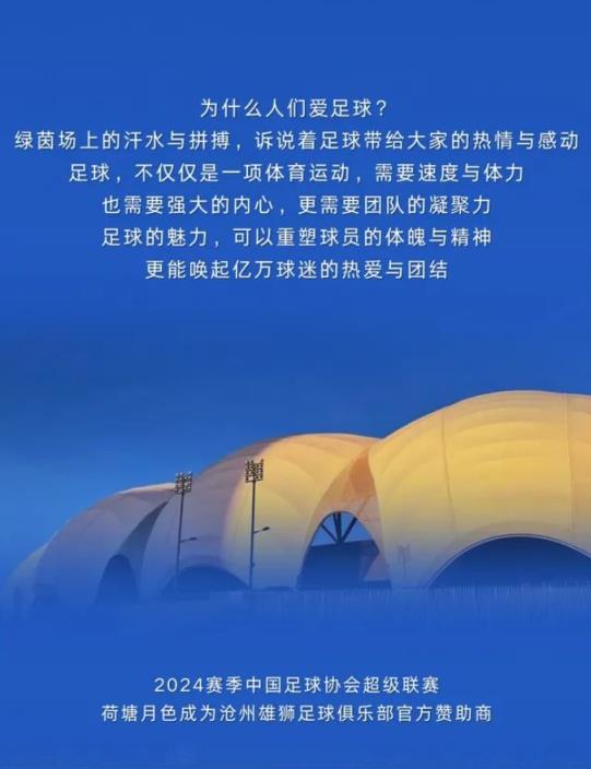 该品牌介绍道:2024年荷塘月色助力沧州雄狮,源自双方对足球共同的理念与热爱。通过竞技的力与美带给观众享受,同时注重传递足球比赛背后蕴藏的丰富精神内核与社会正能量。荷塘月色的赞助恰逢其时,此次合作,不仅体现了对足球运动的深厚情感,更是对沧州雄狮足球俱乐部未来发展的坚定信念。正如春天的到来预示着生机勃勃的开始,荷塘月色与沧州雄狮的合作也充满了无限的希望和美好的展望。