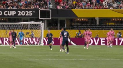 06月30日讯 巴黎vs迈阿密第73分钟,苏亚雷斯争顶犯规,随后抗议判罚,被裁判出示黄牌。