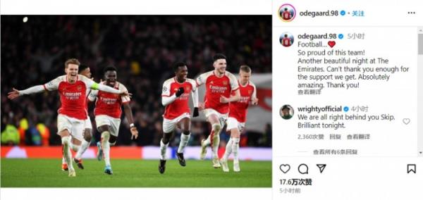 厄德高写道:“足球……为这支球队感到无比自豪!酋长球场的又一个美妙夜晚!球迷们对我们的支持,怎么感激都不为过!真的太棒了!谢谢你们!”