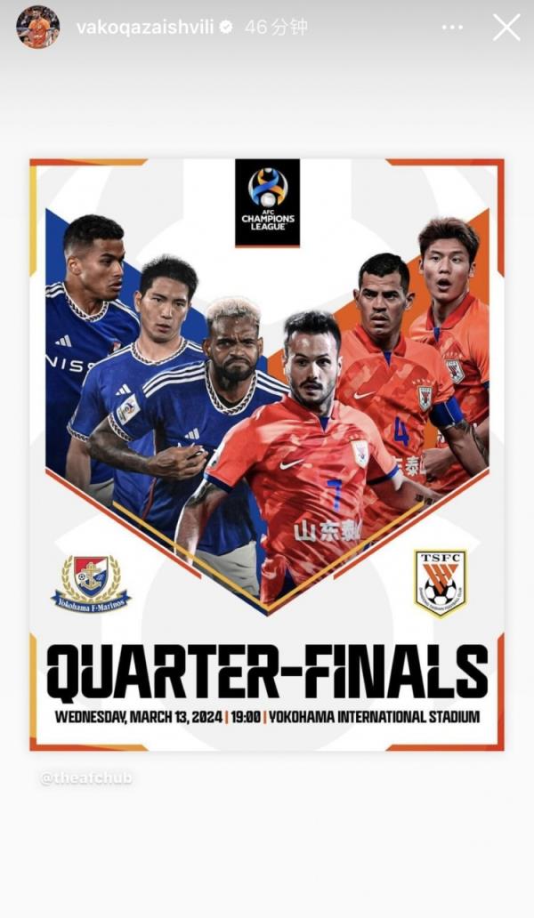 3月13日讯 今天中午,泰山外援卡扎伊什维利更新社媒,发布了亚冠1/4决赛次回合的比赛海报。