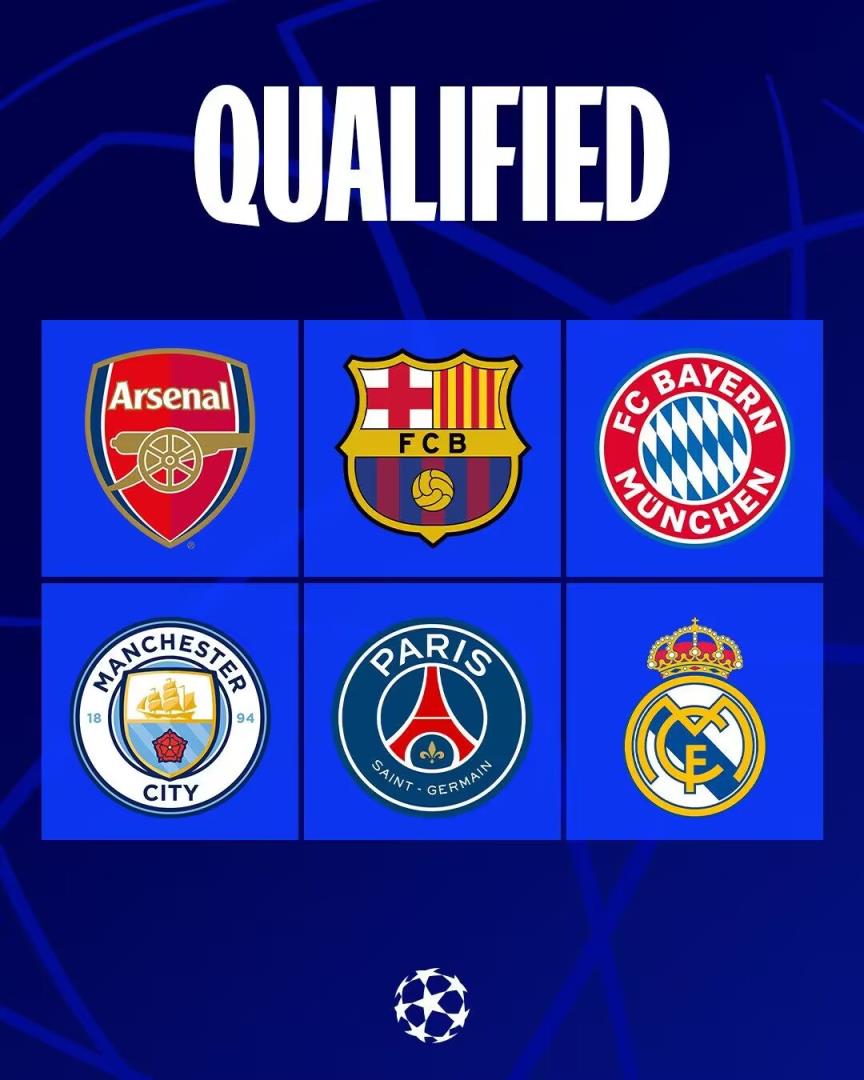本赛季欧冠8强已出炉6席:拜仁、巴黎、皇马、曼城、阿森纳、巴萨。