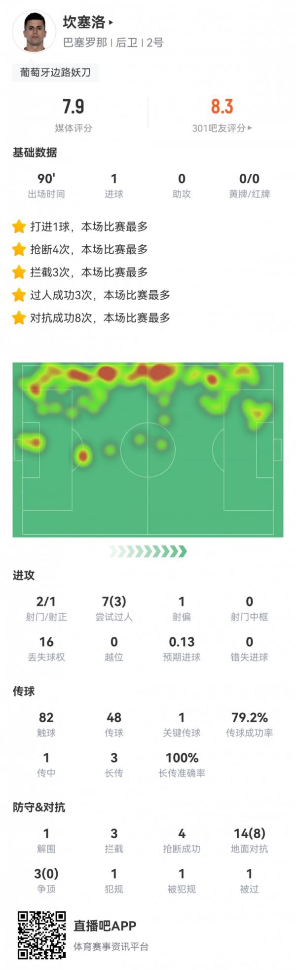 3月13日讯 欧冠1/8决赛次回合,巴萨主场3-1、总比分4-2战胜那不勒斯晋级八强。此役坎塞洛首发打满全场打进一球,球员全场重点数据如下↓