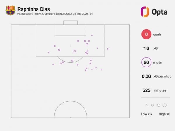 据Opta统计,拉菲尼亚加盟巴萨以来出战10场欧冠比赛,射门26次未能取得进球,他是2003-2004赛季有统计以来欧冠尝试射门最多但未能破门的巴萨球员。