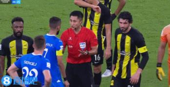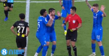 利雅得新月围上来提出异议,认为该出红牌,新月中场法拉吉也吃到了马宁黄牌!