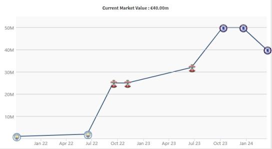03月16日讯 近日德转更新了部分英超球员的身价,其中本赛季初加盟切尔西的20岁小将拉维亚身价下跌1000万欧,至4000万欧。