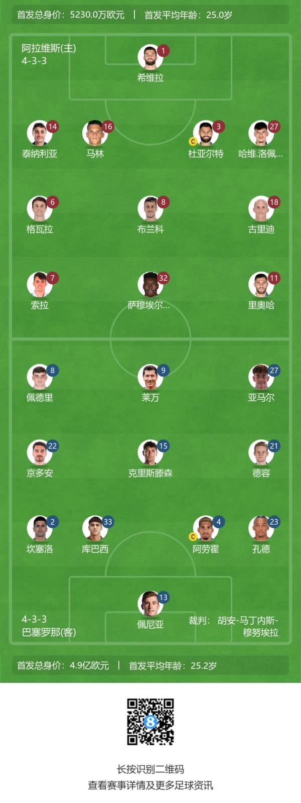 阿拉维斯首发:1-希维拉、3-杜亚尔特、14-特纳利亚、16-拉法-马林、7-索拉、6-格瓦拉、8-布兰科、18-古里迪、11-里奥哈、27-哈维-洛佩斯、32-奥莫罗迪翁