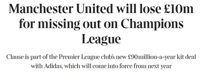 3月16日讯 据《泰晤士报》报道,从下赛季起,曼联每次未能获得欧冠资格,将被赞助商阿迪达斯罚款1000万镑。