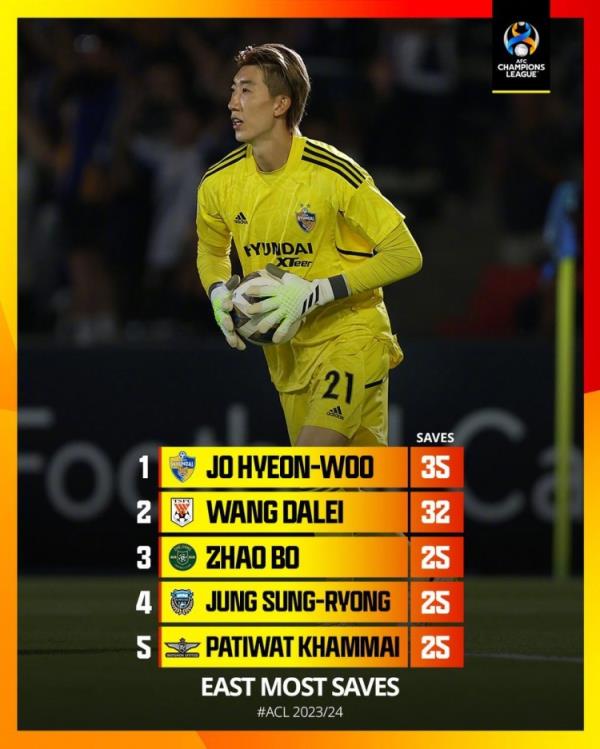 榜单第三位到第五位的三名门将扑救次数相同,都为25次,其中包括了浙江队的赵博,以及韩国门将郑成龙和泰国门将巴提瓦。由于所在球队已经出局,王大雷和赵博都已无法继续刷新在亚冠联赛的扑救数据。