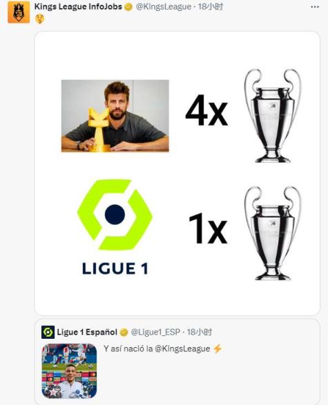 法甲西语官推晒皮克拉不住姆巴佩的名画,配文:“国王联赛因此诞生。”国王联赛官推则晒皮克4欧冠、法甲1欧冠的图片回应“