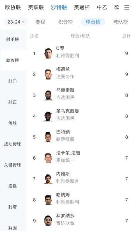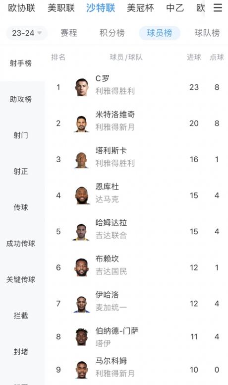 此役后,C罗以23粒联赛进球继续领跑射手榜,同时他9次助攻也是并列联赛最多。