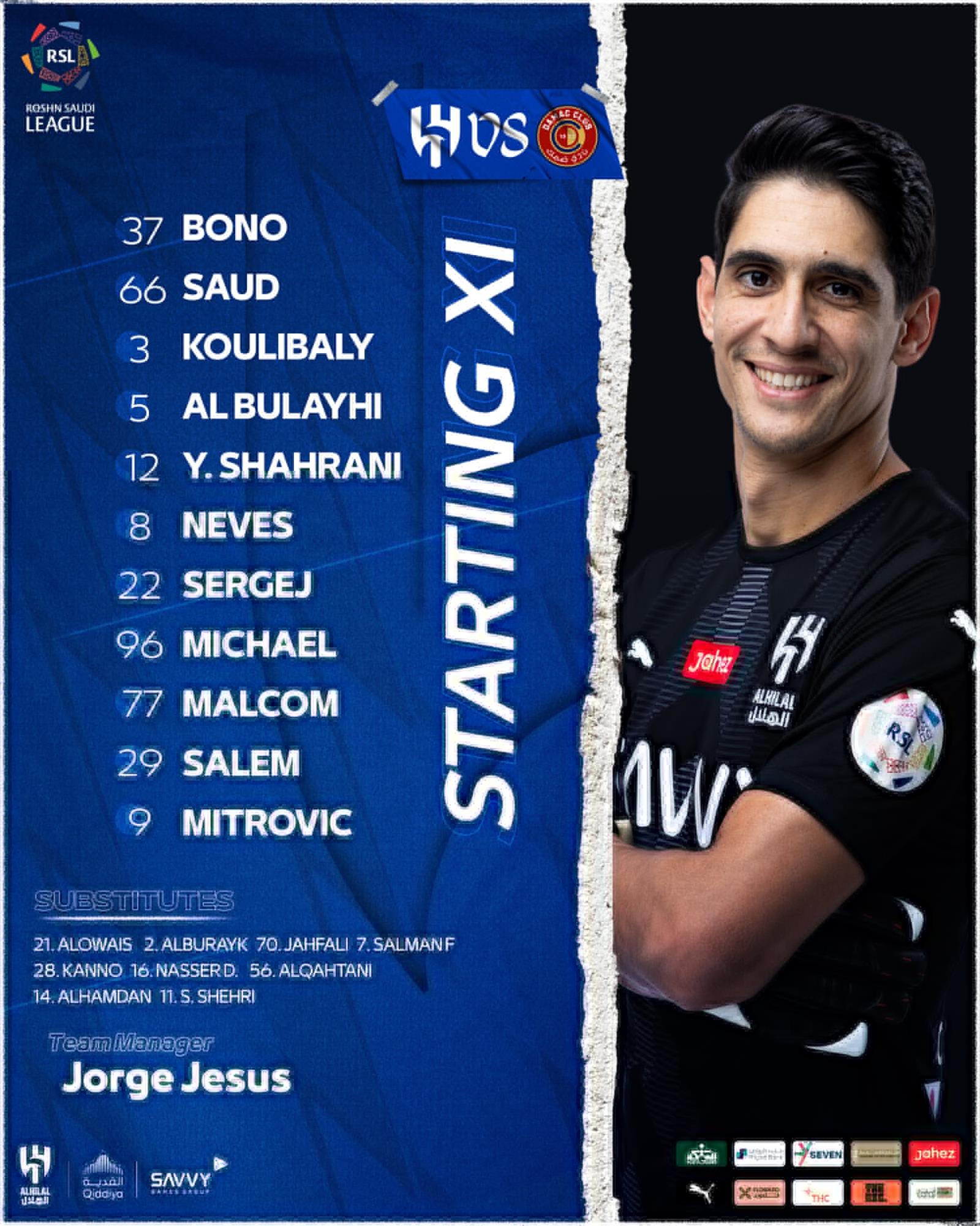 利雅得新月首发:37-布努、66-阿卜杜勒哈米德、3-库利巴利、5-布莱希、12-沙赫拉尼、8-鲁本-内维斯、22-米林科维奇、96-迈克尔、77-马尔科姆、29-萨勒姆-多萨里、9-米特洛维奇